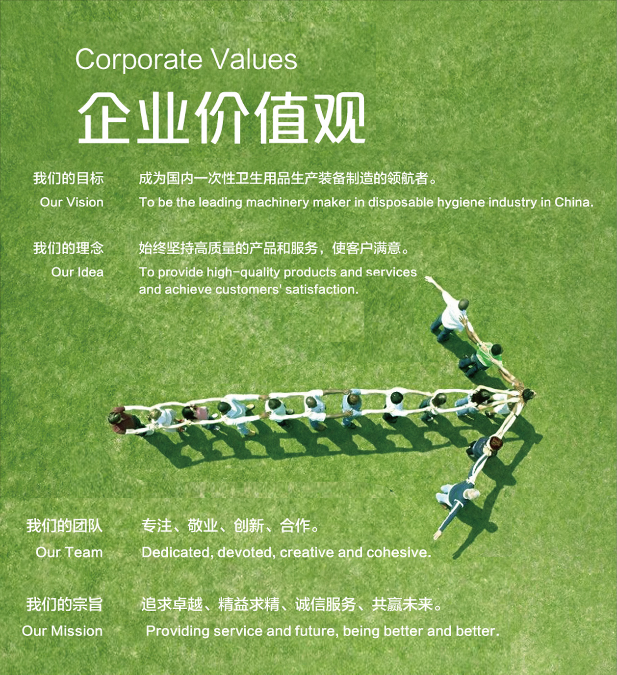 首頁 富田簡介 產(chǎn)品中心 設(shè)備技術(shù) 新聞資訊 人才招聘 服務(wù)信息 聯(lián)系富田 公司簡介 富田價值觀 富田榮譽 富田文化 富田價值觀 目標(biāo):成為國內(nèi)一次性衛(wèi)生用品生產(chǎn)裝備制造的領(lǐng)航者。理念:始終堅持高質(zhì)量的產(chǎn)品和服務(wù),使客戶滿意。團隊:專注、敬業(yè)、創(chuàng)新、合作。宗旨:追求卓越、精益求精、誠信服務(wù)、共贏未來。